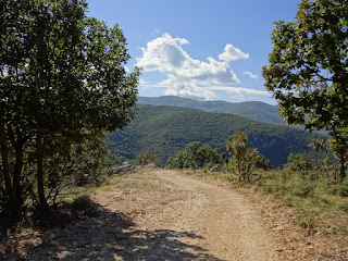 I left early to enjoy the cool of the day, the noise of my departure masked by the racket made by the council rubbish collection. The first part of the day was climbing through the typical oak woods, occasionally on sections of tarmac road but mainly on dirt tracks. In amongst the woodlands were small orchards of what appeared to be cherry trees, some neglected but others being maintained to a high standard. Archaggelos was the first village where the local market was selling fish, clothes, biscuits, cheese and the like. I watched the scene over coffee at one of the nearby cafés. Then it was along a dirt road rising for a while and then loosing all the height gained today and yesterday (a depressing thought). As the track down had innumerable twists and turns the section took longer than I had hoped. Near the bottom pomegranate trees grew beside the track, the over-ripe fruit splitting in a macabre "grin" to reveal the seeds inside. Eventually I reached the village of Foustani at the base of the hills in time for lunch. Ordering was helped by a kind lady who spoke English and lived next to the cafe come restaurant. One Internet source indicated accommodation was available in the village (oreivatein.com), so I asked the lady about it. The rooms were just opposite but it appeared the owners were elsewhere and had not left the key with the usual lady.